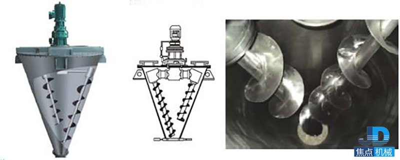 DSH系列的錐形混合機筒內(nèi)兩只非對稱螺旋自轉(zhuǎn)將物料向上提升,轉(zhuǎn)臂慢速公轉(zhuǎn)運動;使螺旋外的物料,不同程度進(jìn)入螺柱,從而達(dá)到全圓周方位物料的不斷更新擴散,被提到上部的兩股物料再向中心凹穴匯合,形成一股向下的物料流,補充了底部的空缺,從而形成對流循環(huán)的三重混合效果;標(biāo)準(zhǔn)型錐形螺旋混合機有兩根攪拌螺旋,實際應(yīng)用中根據(jù)設(shè)備規(guī)格大小可以采用單(一根長螺旋)、雙(長短各一兩根不對稱螺旋)、三(兩短一長對稱布置)根螺旋;理論上攪拌螺旋越多,混合效果越好;設(shè)備一般采用梅花狀“錯位閥”,此閥與長螺旋底部貼合緊密,有效減少混合死角,驅(qū)動形式有手動和氣動可選;根據(jù)用戶需要,也可加裝蝶閥、球閥、星形卸料器、邊出料等。