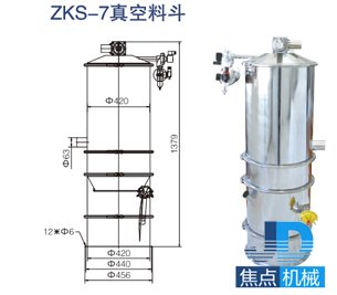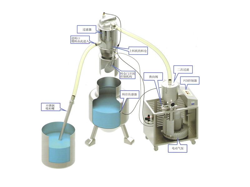 電動真空加料機由電動氣泵產(chǎn)生真空即負壓,這樣真空加料機將通過輸料管從儲料倉中將物料吸入上料機料倉內(nèi),再經(jīng)過過濾器將氣物分離,上料時間由PCB控制器決定,吸料結(jié)束,氣動開閉機構(gòu)將料倉門打開將物料放入相關(guān)的設備中,反吹裝置將反吹吸附在過濾器上的粉末,將粉末清除掉,然后再關(guān)閉料倉門,下一個循環(huán)開始。